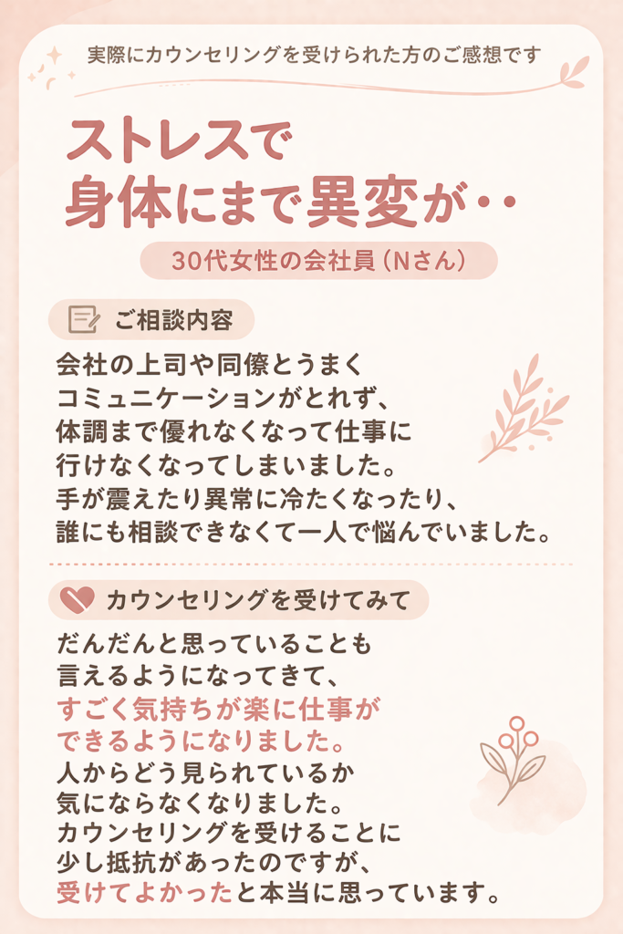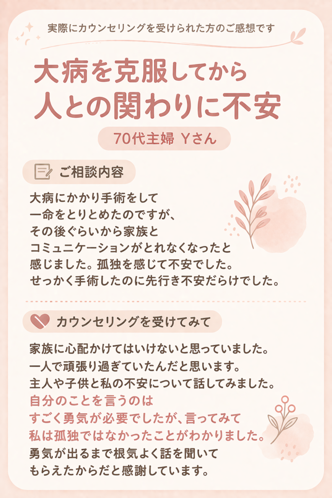 あなたのペースを大切に進めていきますので、安心してお話しくださいね。
